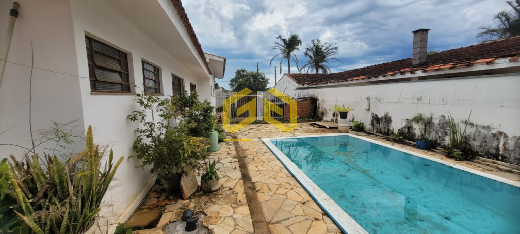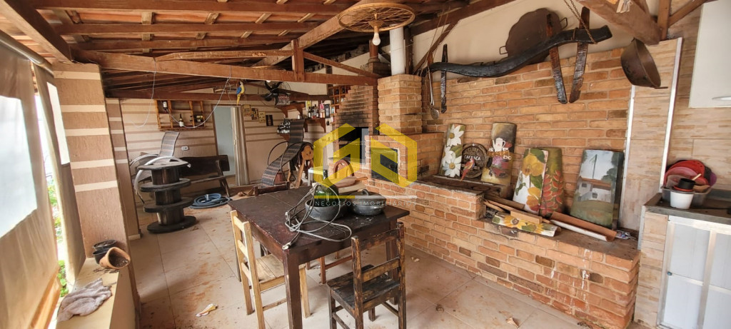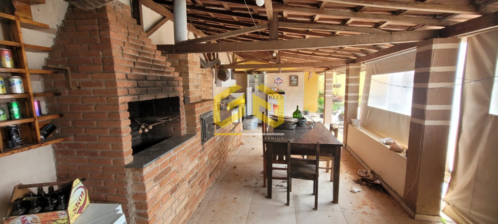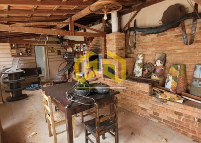Área externa com banheiro, lavandeira, churrasqueira, fogão a lenha e piscina.